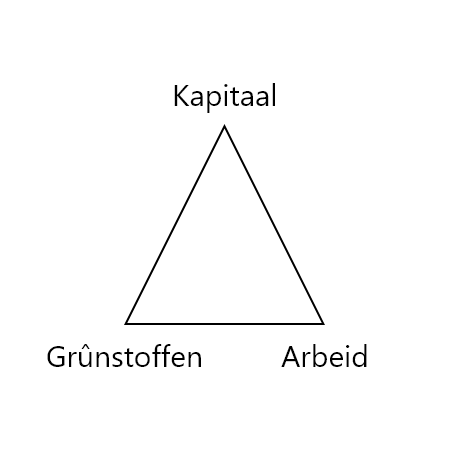 It kapitaal is fierwei de wichstichste faktor yn it hjoeddeistige kapitalisme; de twa oare produksjefaktoaren, arbeid en grûnstoffen, binne folslein ûndergeskikt oan it kapitaal. Dat is in gefolch fan it sûnt de tachtiger jieren oerhearskjende (neo-)liberalisme! Yn ûndersteande trijehoek stiet it kapitaal dan ek boppeoan; grûnstoffen en arbeid foarmje de basis fan ‘e trijehoek. Dat betsjut dat sa wol minsken as de ierde útrupele wurde en dat alles draait om it kapitaal fierder waachsje te litten. It is in sabear ‘vulgêr’ kapitalisme; sosjale aspekten en it miljeu dogge der net echt ta!